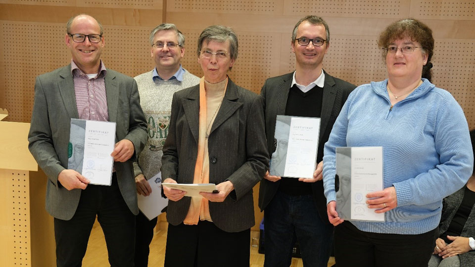 Im Bild von links nach rechts: Mag. Arnold Schett (Alten- und Pflegeheime GmbH der Barmherzigen Schwestern Innsbruck); Manfred Neurauter (Wohn- und Pflegeheim St. Vinzenz der Barmherzigen Schwestern); Generaloberin Sr. Pauline Thorer; Mag. Andreas Partl (Wirtschaftsleiter der Kongregation/Provinz Innsbruck); Dr. Ruth Mockel (Geschäftsführerin Haus Marillac)
